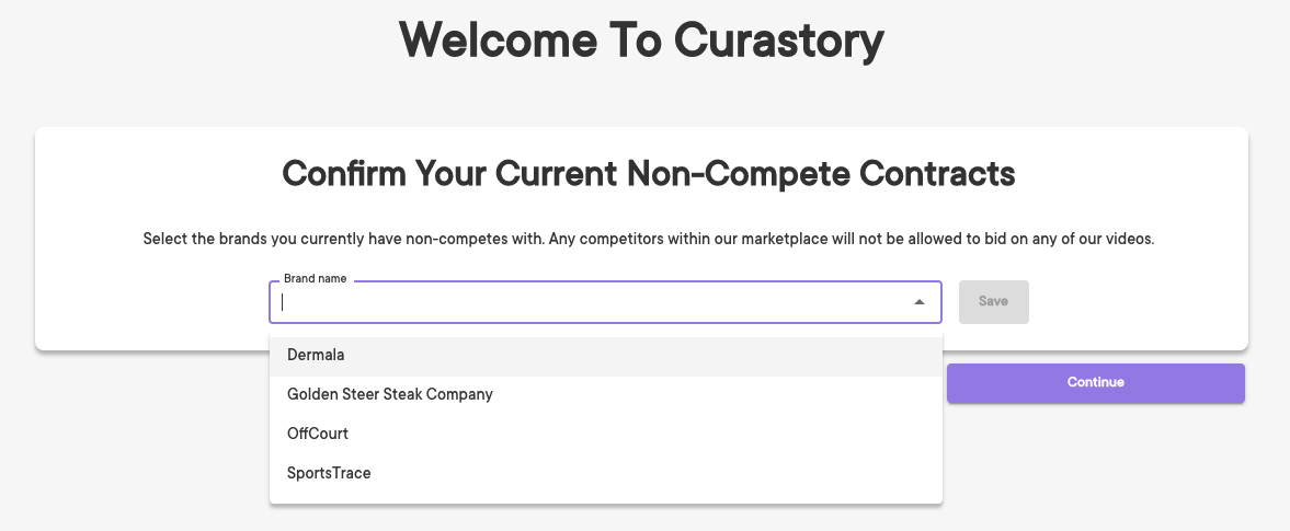 For the non-compete feature, creators can browse all of our brand partner customer accounts and add them to their account settings if they have a contract with them offline. For example, one of our creators on the platform now has an offline relationship with Beyond Meat, who is a current brand partner customer running campaigns through Curastory.